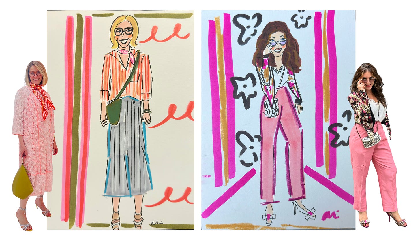 While I missed getting my ’fit memorialized that evening on the spot, she still graciously agreed to draw me and i/Edit editor Sara Lieberman. Her ability to find a subject’s essence in an instant is an art form. Look at how she captured us both! I love how she went off-script a bit with mine, injecting her interpretation of other looks I sent her, but leaving on my signature glasses, scarf, and favorite Esha Soni bag!