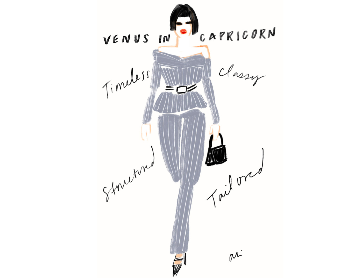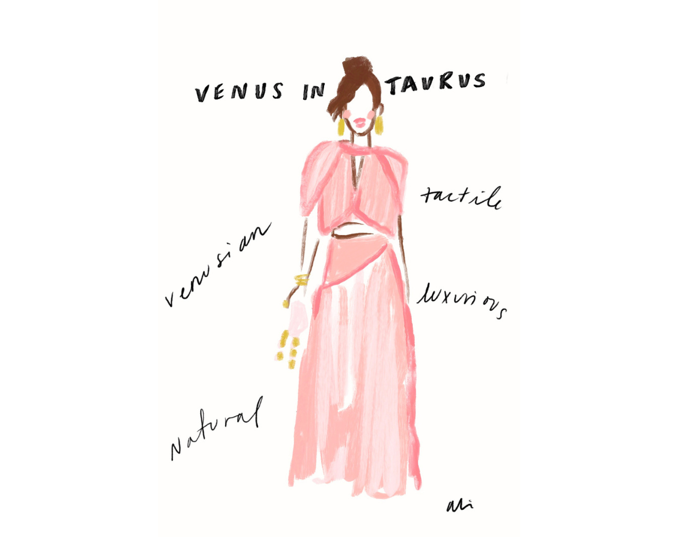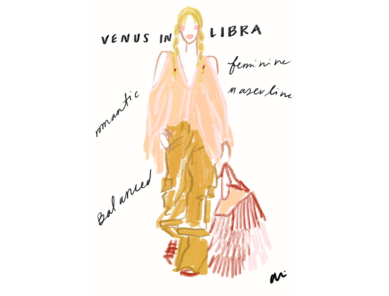 For those of us (this Libra, included) who know little more than our sun sign and what it may mean when Mercury is in retrograde (to beware!), a little guidance goes a long way, so when Ali offered to create exclusive illustrations for i/Edit — one for each zodiac sign with style suggestions that align with Venus — I said, “yes, please!”