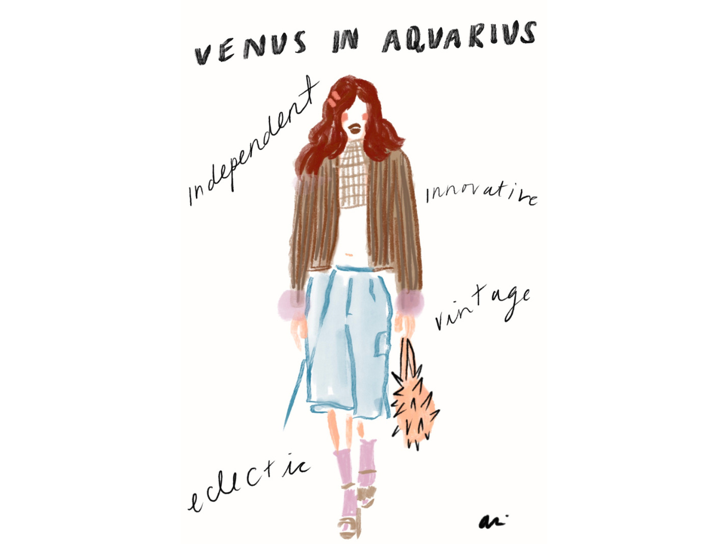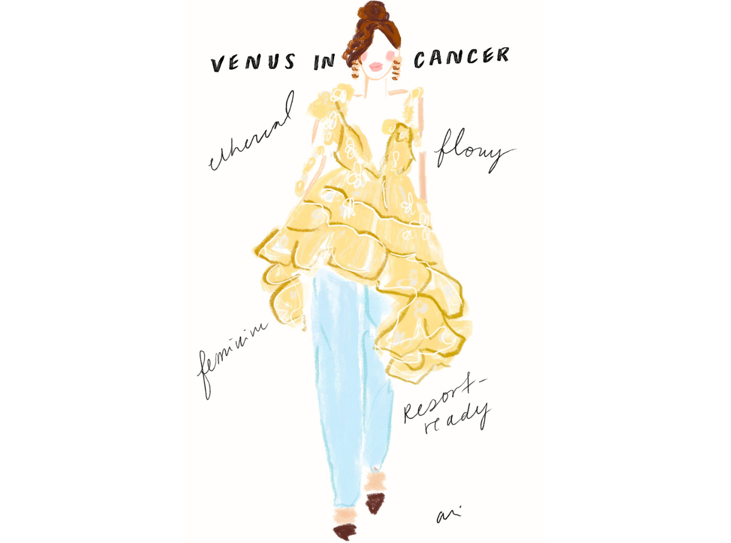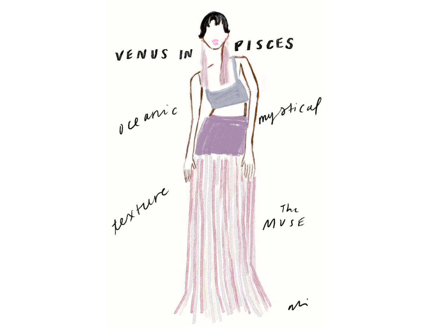 For those of us (this Libra, included) who know little more than our sun sign and what it may mean when Mercury is in retrograde (to beware!), a little guidance goes a long way, so when Ali offered to create exclusive illustrations for i/Edit — one for each zodiac sign with style suggestions that align with Venus — I said, “yes, please!”